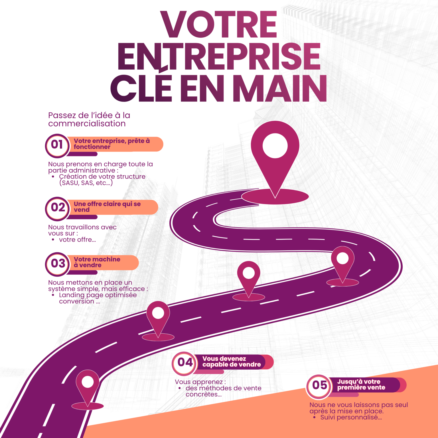 Une approche concrète, orientée résultats, conçue pour transformer une idée en chiffre d’affaires.
